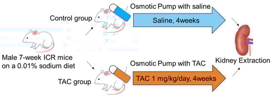 Seven-week-old male ICR mice were fed a low sodium diet (0.01% sodium, CLEA Japan, Inc., Tokyo, Japan) ad libitum. After seven days, mice were divided into two groups. Osmotic pumps (ALZET® osmotic pump 2004, ALZET Osmotic pumps, Cupertino, CA, USA) in the TAC group were filled with TAC (Prograf®, Astellas Pharma, Inc., Tokyo, Japan) at 1 mg/kg/day, calculated from the flow rate, whereas osmotic pumps for the control group were filled with normal saline. After 40 h of incubation in saline at 37 °C, pumps were implanted subcutaneously in the backs of mice for continuous administration. After 28 days of continuous subcutaneous administration, mice were weighed before renal tissue collection. Renal tissue collection was performed under isoflurane anesthesia (induction concentration 4–5%, maintenance concentration 2–3%). This protocol was performed as previously reported [12,13] (Figure 1).