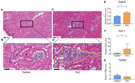 Evaluation of renal tissue damage. (A–D) show the results of Masson trichrome staining of kidney samples. These are representative pathological findings for each group. (A,B) are pathological findings of the Control group, and (B) is a magnified image of (A). (C,D) are pathological findings of the TAC group, and (D) is an enlarged image of (C). Yellow dotted line in (D) shows the tubular and intestinal fibrosis. All scale bars are 50 μm (n = 5/group). Quantitative PCR (qPCR) results are shown in (E–G). (E) Actin alpha 2 (Acta2), (F) Kidney injury molecule-1 (Kim-1), and (G) Transforming growth factor beta1 (Tgfb1). Statistical analysis was performed using an unpaired t-test. (* p < 0.05, n = 10/group).