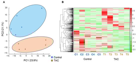 Principal Component Analysis and Heatmap of Hierarchical Clustering Analysis. 545 metabolites in renal tissue were examined in our metabolomic analysis. A clear difference was found between the TAC and control groups with principal component analysis (PCA) and a heatmap displaying hierarchical clustering analysis (HCA). (A) Results of PCA. The horizontal axis indicates the first principal component score (PC1), and the vertical axis shows the second principal component score (PC2). The control group (blue), and the TAC group (orange) differed significantly in metabolite profiles. (n = 5/group). (B) Heatmap displaying HCA of metabolites with a tree of sequences. The bar on the right side of the heatmap shows the relationship between the measured values and the color of each sample. Red indicates values higher than average, and green denotes values lower than average. The vertical axis shows metabolites. The horizontal axis identifies samples C1 to C5 in the Control group, and T1 to T5 indicates individuals in the TAC group (n = 5/group).