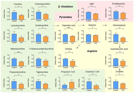 Thirty-two metabolites were significantly higher and 33 were significantly lower in the TAC group (Table 1 and Table 2). Of metabolites that showed significant changes, carnitine and carnitine-related metabolites accounted for eighteen. Carnitine-related metabolites represented 27.7% of all metabolites with significant differences, which is the highest share ratio of any metabolites (Figure 4). Carnitine and acylcarnitines (acetylcarnitine, propionylcarnitine, lauroylcarnitine, malonylcarnitine, tiglylcarnitine, and octanoylcarnitine) were significantly lower in the TAC group than in the control group (Figure 5, Table 2). Aspartic acid, which is produced from acetylcarnitine, was also significantly lower in the TAC group. Arginine, which is produced from aspartic acid, was lower in the TAC group, as were homoarginine, guanidinoacetic acid, creatine, and ornithine. As aspartic acid is also involved in pyrimidine metabolism, UMP was also significantly lower in the TAC group (Figure 5, Table 2).