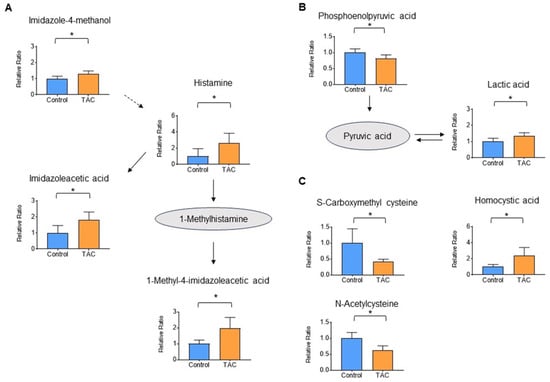 Histamine, glycolytic, and antioxidant metabolites measured by metabolome analysis. Orange columns represent the TAC group, and blue columns represent the Control group. The vertical axis is the relative ratio. Solid lines indicate the relationship between metabolites produced and precursors. Dotted lines indicate relationships for metabolite production. (A) Metabolites related to the histamine pathway (B) Metabolites related to the glycolytic pathway. (C) Metabolites related to antioxidants (* p < 0.05) (n = 5/group).