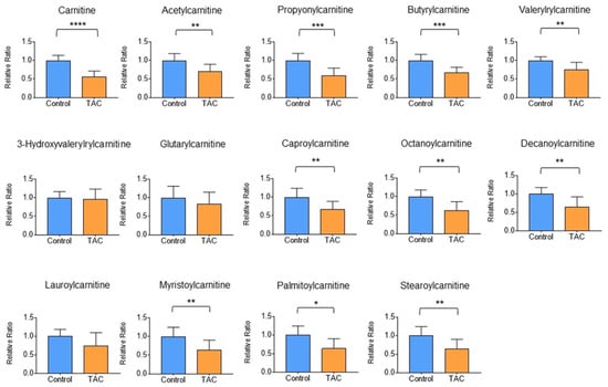 Detailed analysis of carnitine and short-, medium-, and long-chain acylcarnitines in metabolites in renal tissue was performed using LC-MS/MS. Carnitine and 10 acylcarnitines were significantly lower in the TAC group. Acylcarnitines that were significantly lower in the TAC group included acetylcarnitine, propionylcarnitine, butyrylcarnitine, isovalerylcarnitine, capronylcarnitine, octanoylcarnitine, decanoylcarnitine, myristoylcarnitine, palmitoylcarnitine, stearoylcarnitine (Figure 7). No acylcarnitine was significantly higher in the TAC group.