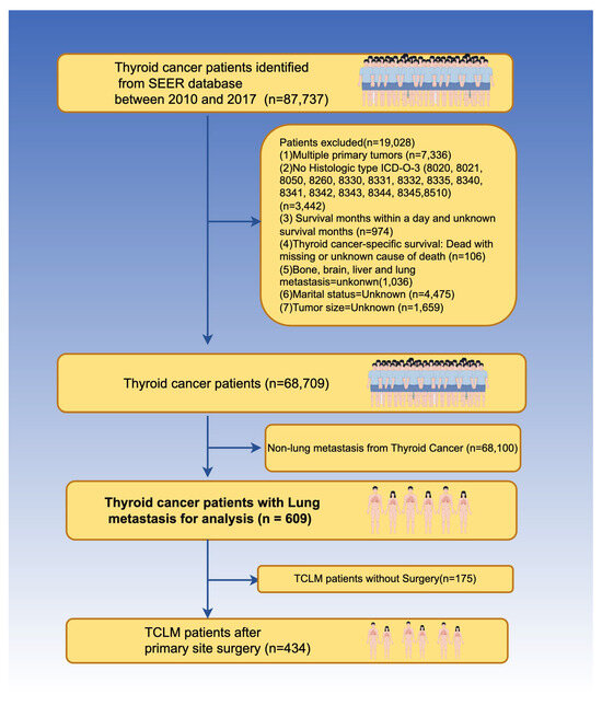 The study retrieved data from the SEER database, which included variables such as race, sex, marital status, histological type ICD-O-3 [PTC (8050, 8260, 8340, 8341, 8342, 8343, 8344), MTC (8345, 8510), FTC (8330, 8331, 8332, 8335), ATC (8020, 8021)] [24], T stage, N stage, SEER-specific etiology of death classification, vital status, and survival time (months). Other races encompassed American Indian/Alaska Native, Asian or Pacific Islander, and unknown racial groups, due to their representation of only 1% of the SEER database. TNM staging and stage data were based on a combination of derived AJCC 7th (2010–2015) data and derived SEER combined TNM data due to constraints in the composition of the SEER database across years. Exclusions were made for TC patients with unknown demographic and clinicopathological information from 2010 to 2017. Despite marital status being a significant determinant in various cancers, its significance in thyroid cancer remains unknown. Therefore, patients with uncertain marital status were eliminated to investigate the impact of marital status on the prognosis of TC patients [25,26]. Thyroid cancer patients were classified into two groups: those with and without lung metastases. In TCLM patients, an additional distinction was made based on whether primary surgery was performed. The detailed screening process is illustrated in Figure 1.