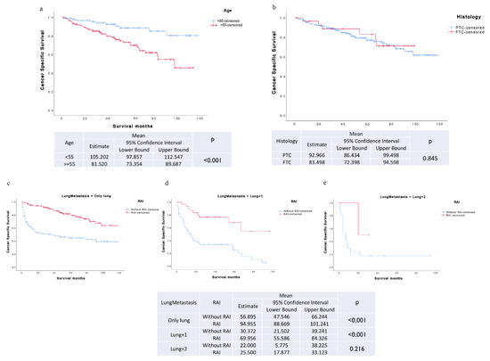 To analyze the difference in survival among TCLM patients who underwent surgery at the primary site, the Kaplan–Meier method and log-rank test were utilized. The Kaplan–Meier analysis was stratified based on RAI treatment, age, histology, and other distant metastases.