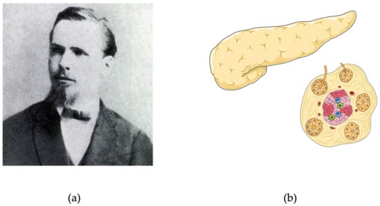Many discoveries were made in the 19th century. In 1815, Michel-Eugene Chevreul identified glucose in urine; a few years later, in 1869, Paul Langerhans described nests of cells in the pancreas; these were later named the “Islets of Langerhans” by Gustave-Edouard Laguesse in 1983 (Figure 1). Twenty years later, in 1889, Von Mering and Minkowsky, two physiologists from the University of Strasbourg, removed a pancreas to test it in a living organism (dog) and observed that its absence induced an excess of sugar in the urine, and subsequently, they found that the pancreas secreted something that reduced the levels of sugar [,]. A few years later, in 1891, Eugène Gley confirmed this discovery and revealed that the atrophy of the acinar pancreas did not result in experimental diabetes, and looked for pancreatic extracts which reduced glucosuria; however, Gley did not publish his results []. Instead, it was Georg Ludwig Zuelzer who was the first to publish the use of pancreatic extracts, which he called “Acomatol”, on diabetic dogs. He also tried to use Acomatol to treat eight diabetic patients, observing variable reductions in glycosuria and ketonuria, but this also resulted in very severe side effects [].