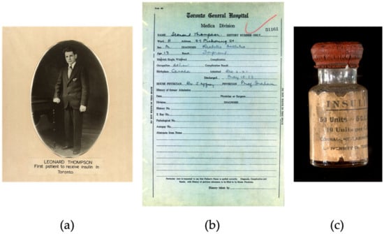 The first successful insulin administration []. (a) Photography by Leonard Thompson. (b) Extract from the patient’s medical record at the Toronto hospital after insulin administration. (c) Insulin vial.