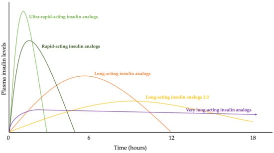 Specifically, we know that, in people without diabetes, the maximum peak of insulin secretion occurs 1 h after ingestion and returns to normal levels after another 2 h. However, to achieve a normal insulin profile for 24 h and avoid nocturnal hypoglycemia in diabetic patients, it is necessary to use other insulin formulations that prolong the duration of action.