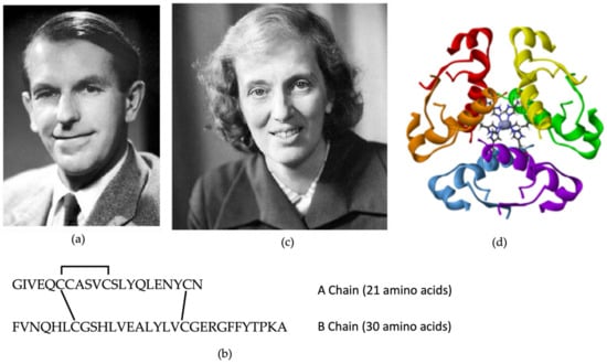 Until that moment, all insulins that had been produced were of animal origin, requiring approximately 50 pigs to cover the annual insulin needs of a patient. This meant that insulin treatment was only available to a few. That changed in 1953, when the British biochemist Frederick Sanger finally determined, after 10 years of work, the amino acid sequence of bovine insulin. Sanger determined that it had two chains, which he called A and B []. Chain A had 21 amino acids and chain B, 30 amino acids (Figure 5a,b). They were joined by two disulfide bridges and there was another of these bridges between the amino acids of chain A. Years later, in 1969, it was Dr. Dorothy Crowfoot Hodgkin who would finally describe the three-dimensional structure of the molecule (Figure 5c,d) []. Both received the Nobel Prize in Chemistry in 1958 and 1964, respectively, and their discoveries were the beginning of the race to achieve the synthesis of the insulin molecule [,].