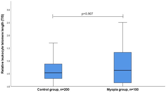 Relative leukocyte telomere length in control and myopia groups. The X-axis shows the study groups, the Y-axis shows the relative leukocyte telomere length, and the blue rectangles divided by the medians denote the quartiles. The lower part is the first quartile, and the upper part is the third quartile; p-value is the significance level (differences are considered statistically significant if p < 0.05).