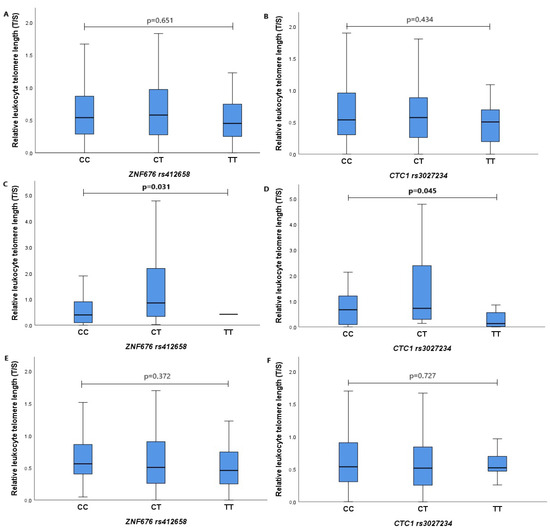 Relative leukocyte telomere length’s association with ZNF676 rs412658 and CTC1 rs3027234 gene polymorphisms in subjects. Blue rectangles, divided by medians, denote quartiles. The lower part is the first quartile, and the upper part is the third quartile. The X-axis represents polymorphism genotypes, the Y-axis indicates relative leukocyte telomere length; p-value indicates the level of significance (differences are considered statistically significant when p < 0.05). (A)—the relationship between relative leukocyte telomere length and ZNF676 rs412658 polymorphism in both groups; (B)—the relationship between relative leukocyte telomere length and CTC1 rs3027234 polymorphism in both groups; (C)—the relationship between relative leukocyte telomeres and ZNF676 rs412658 polymorphism in the myopia group; (D)—the relationship between relative leukocyte telomeres and CTC1 rs3027234 polymorphism in the myopia group; (E)—the relationship between relative leukocyte telomeres and ZNF676 rs412658 polymorphism in the control group; (F)—the relationship between relative leukocyte telomeres and CTC1 rs3027234 polymorphism in the control group.