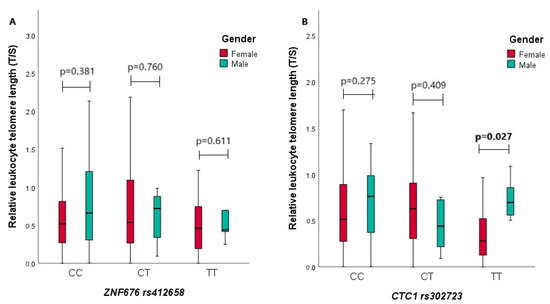Comparison of relative leukocyte telomere length and genotypes of ZNF676 rs412658 and CTC1 rs3027234 gene polymorphisms in male and female groups in all study participants. (A,B) On the X-axis, the genotypes of ZNF676 rs412658 and CTC1 rs3027234 gene polymorphisms are illustrated, with the Y-axis representing the relative leukocyte telomere length. Red and green rectangles, separated by medians, signify quartiles. The lower segment represents the first quartile, and the upper segment represents the third quartile. The p-value indicates the level of significance, with differences considered statistically significant when p < 0.05.
