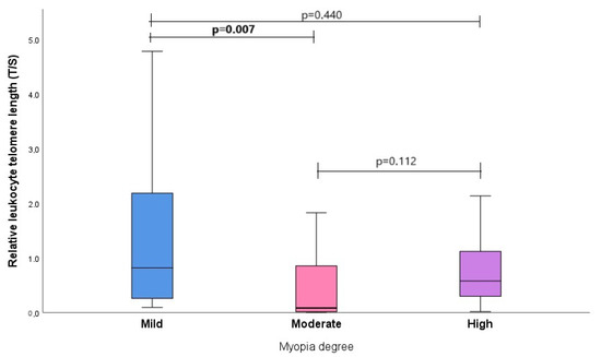 Continuing the study, the relative LTL was also compared in the study subjects concerning the degree of myopia. Subjects’ median (IQR) for mild, moderate, and high myopia was 0.819 (1.983) vs. 0.083 (0.930) vs. 0.578 (0.927), respectively. The comprehensive p-value, assessing the relative LTL of subjects across the three levels of myopia, was determined to be 0.027. This signifies a statistical difference in the relative LTL among individuals with varying degrees of myopia. The relative LTL was also compared between different degrees of myopia (Figure 5). In Figure 5, it can be seen that there was a statistically significant difference in the relative LTL between mild and moderate myopia degrees (0.819 (1.983) vs. 0.083 (0.930), p = 0.007).