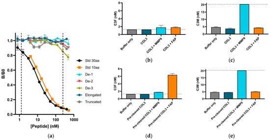 Assay specificity: (a) Standard curves of signal inhibition relative to background (B/B0) with increasing peptide concentrations for 30aa selection peptide (std) (AGPAGAPGPAGSRGAPGPQGPRGDKGETGE), 10aa selection peptide (AGPAGAPGPA), deselection peptide (De) 1, 2, and 3 (AGPAGAAGQP, PGPAGAPGPA, and AGPQGAPGPA, respectively), elongated peptide (PAGPAGAPGPA), and truncated peptide (_GPAGAPGPA). Dotted lines indicate measurement range. (b,c) Biomarker measurements of C3F (b) and C3M (c) in solution of recombinant type III collagen (COL3) after incubation with/without matrix metalloproteinases 9 (MMP9) or fibroblast activation protein (FAP), with buffer as control. (d,e) Biomarker measurements of C3F (d) and C3M (e) in solution of recombinant type III collagen pre-cleaved with MMP13 (pre-cleaved COL3) followed by incubation with/without MMP9 or FAP, with buffer as control. Dotted lines indicate lower limit measurement range (LLMR) for C3F (b,d) and upper limit measurement range (ULMR) for C3M (c,e).