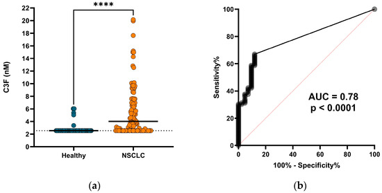Diagnostic potential of C3F for patients with NSCLC: (a) C3F biomarker levels in serum from healthy subjects (n = 42) and patients with NSCLC (n = 109). Black lines indicate median values, dotted lines indicate LLMR (adjusted for dilution). **** indicates p < 0.0001. (b) Receiver operating characteristic (ROC) curve for patients with NSCLC and healthy subjects described in (a). Area under the curve (AUC) and p-value are shown.