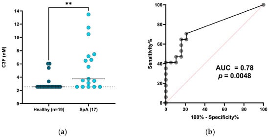 Diagnostic potential of C3F for patients with SpA: (a) C3F biomarker levels in serum from healthy subjects (n = 19) and patients with SpA (n = 17). Black lines indicate median values, dotted lines indicate LLMR (adjusted for dilution). ** indicates p < 0.01. (b) ROC curve for patients with SpA and healthy subjects described in (a). AUC and p-value are shown.