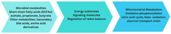 This figure illustrates the dynamic interrelationship between microbial metabolites and mitochondrial metabolism. Microbial metabolites, such as SCFAs and various other bioactive compounds, exert a significant influence on cellular energy production and intercellular signaling processes.