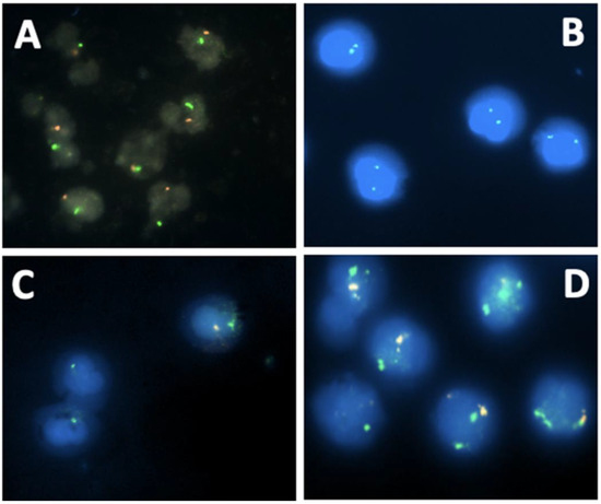 Using telomere and centromere-specific probes, several additional structural chromosome aberrations were identified in metaphases from eight of the patients (22%), such as a dicentric chromosome (Figure 3A) and acentric chromosomes with chromosome deletions (2 patients) (Figure 3B). Telomere fusions (3 patients) (Figure 3C) were observed in addition to chromosome fragmentations (2 patients) (Figure 3D), as well as chromosomal breaks (3 patients).
