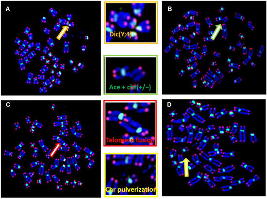 - M’kacher, R.; Colicchio, B.; Borie, C.; Junker, S.; Marquet, V.; Heidingsfelder, L.; Soehnlen, K.; Najar, W.; Hempel, W.M.; Oudrhiri, N.; et al. Telomere and Centromere Staining Followed by M-FISH Improves Diagnosis of Chromosomal Instability and Its Clinical Utility. Genes 2020, 11, 475. [Google Scholar] [CrossRef]