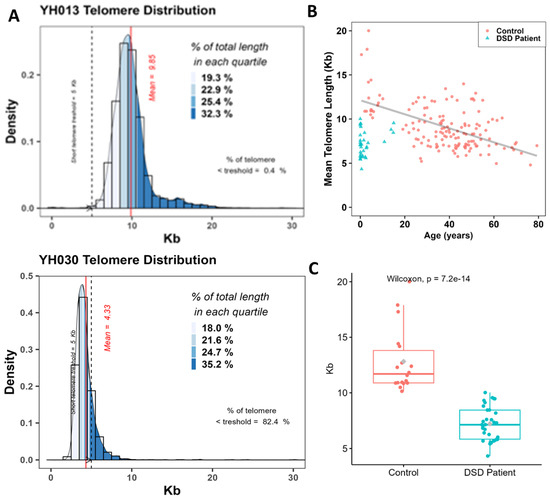 Quantification of telomere length in circulating lymphocytes of DSDs patients. (A) Distribution of the telomere lengths in circulating lymphocytes of patients YH013 and YH030 that exhibit the most extreme telomere lengths in our DSDs cohort. The mean telomere length is presented by the red line and the frequency of cells with extreme telomere shortening (<5 kb) is presented as a dashed blue line. The different quartiles of fluorescence signal intensities in telomeres are also shown. (B) Telomere length (kb) as a function of age in lymphocytes from healthy donors (150 donors, mean age 36 years, range 0.5–79 years) (red circles) and in DSDs patients (blue triangle). (C) A significant difference between the means of telomere length of DSD patients and those from healthy donors with similar ages.