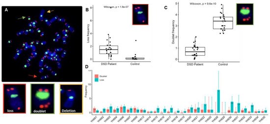 Telomere aberrations are identified by assessing telomeres on individual chromosomes in metaphases of circulating lymphocytes. (A) Representative metaphase after telomere (red) and centromere (green) staining showing different types of telomere aberrations: telomere loss (red arrow), telomere doublet (green arrow), and telomere deletion (yellow arrow). (B,C) Frequencies of telomere losses and telomere doublet formations per cell in DSDs patients and in the control panel with similar age. A significant increase in the frequency of telomere loss was observed in DSDs patients in comparison to the control group (p < 1.8 × 10−7). A significant decrease in telomere doublet formation in DSDs patients was observed compared to that in the control (p < 9.6 × 10−10). (D) The frequency of telomere loss and telomere doublets in each patient shows high inter-individual variation. One hundred metaphases were analyzed per patient.