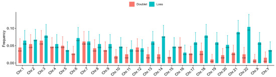 A closer inspection of the data on telomere aberrations in individual chromosomes revealed that many chromosomes, especially chromosomes 21 and 22, were more frequently affected than others (Figure 6).
