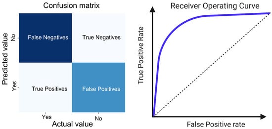 Classification metrics. The left section of the figure displays a confusion matrix, which is a tabular visualization of the predictive accuracy of the model. It categorizes the predictions into four distinct outcomes: true positives and true negatives, which represent the correctly identified instances of the two classes, and false positives and false negatives, which are erroneous predictions where the model incorrectly classifies the instances. The arrangement of these outcomes provides an immediate visual assessment of the classification process of the model, particularly in terms of its precision and recall capabilities. The ROC curve on the right serves as a graphical representation of the diagnostic ability of the model. It contrasts the true positive rate (sensitivity) with the false positive rate (1-specificity) across different thresholds. The diagonal dotted line represents the performance of a random classifier with an AUC of 0.5. The substantial elevation of the ROC curves of the model above this line of no-discrimination confirms the effective discriminative power between the two outcome classes.