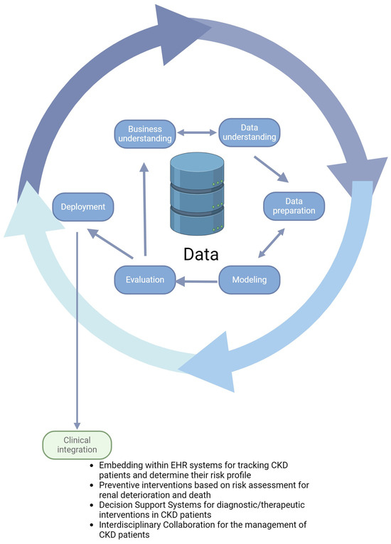 Overview of the standard machine-learning workflow with its integration in clinical practice. The Cross-Industry Standard Process for Data Mining (CRISP-DM) is a robust cyclic methodology that guides the data-mining process. The process initiates with the business understanding phase, which is dedicated to grasping the business aspects of the project and translating them into a data analytical framework. Progressing to data understanding, this stage involves an initial acquisition of data followed by an exploration to familiarize itself with the data characteristics, quality, and potential of the datasets. During this phase, preliminary insights are gleaned and the groundwork for hypothesis formation is laid. Subsequently, data preparation constitutes a critical phase in which raw data undergo transformation and cleansing, ensuring that they are primed for analysis. The modeling phase sees the application of various algorithmic techniques, fine-tuned to model the data effectively on the training and validation set. In the evaluation phase, the models and the entire process undergo scrutiny to ascertain their efficacy in meeting the defined business objectives on the test set. Finally, the deployment phase represents the culmination of the process, where the insights and findings are operationalized [64]. Next, the ML model can be integrated into clinical workflows. These models must be seamlessly incorporated into existing clinical workflows to augment clinical decision making and effectively enhance CKD patient management. This involves embedding the ML model interface within electronic health record (EHR) systems, allowing clinicians to access predictive insights alongside comprehensive patient data without disrupting routine practices. As part of a clinical decision support system (CDSS), the ML model provides clinicians with predictions of CKD progression, identifying patients at high risk of advancing to kidney failure and suggesting potential interventions. These can range from medication adjustments and dietary modifications to discussions about initiating dialysis, enabling earlier and more targeted interventions with the potential to slow disease progression, improve patient outcomes, and reduce healthcare costs. This iterative process is supported by interdisciplinary collaboration that brings together nephrologists, data scientists, IT specialists, and patients to align the model with clinical needs and patient care goals.