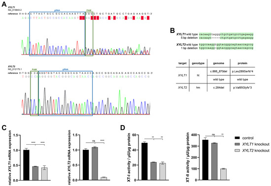 Characterization of XYLT1 or XYLT2 knockout (KO) fibroblasts using an RNP-based CRISPR/Cas9 system. (A) Comparison of the genomic DNA sequences of the KO clones to their respective reference sequence. The blue box marks the binding region of the gRNA (XYLT1: g 211908-211930; XYLT2: g 7647-7669). The PAM is indicated in green. (B) Sequence alignment after TA cloning to identify the mutations and the corresponding names of the clones, as well as the effects on the amino acid sequence (AS) of the XT-I and XT-II proteins (ht = heterozygous; hm = homozygous). (C) Analysis of the XYLT1 and XYLT2 mRNA expression of the KO fibroblasts is shown. Control (n = 1) and both KO cultures (n = 1) were seeded at a cell density of 50 cells/mm2. Relative gene expression analysis was performed after 72 h of cultivation using the ΔΔCT method for the XYLT1 and XYLT2 genes. The expression of RPL13A, SDHA and B2M genes was used for normalization. (D) Analysis of intracellular XT-I and -II activity was performed after 72 h of cultivation using the SPE-UPLC-MS/MS method. Mean values with standard errors shown are composed of three biological and three technical replicates each (ns = not significant; ** p < 0.01; **** p < 0.0001).