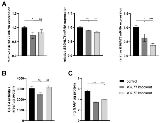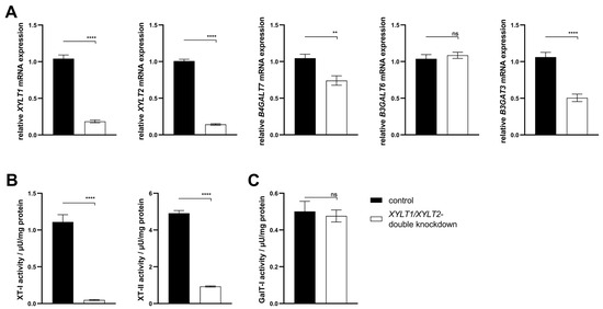 Analysis of the gene expression of XYLT1, XYLT2, B4GALT7, B3GALT6 and B3GAT3 and the activity determination of XT-I, XT-II and GalT-I. (A) The NHDFs (n = 4) were seeded at a cell density of 119 cells/mm2 and transfected Lipofectamine 2000 mediated with 50 nM XYLT1 and 50 nM XYLT2 siRNA. As a control, NHDFs were treated with 100 nM of a control siRNA. A relative gene expression analysis was performed after 48 h of cultivation using the ΔΔCT method for the XYLT1, XYLT2, B4GALT7, B3GALT6 and B3GAT3 genes. The expression of RPL13A and GAPDH genes were used for normalization. Analysis of XT-I and -II activity (B), as well as GalT-I activity (C) was performed after 72 h of cultivation using the SPE-UPLC-MS/MS method. Mean values with standard errors shown are composed of three biological, as well as three technical, replicates each (ns = not significant; ** p < 0.01; **** p < 0.0001).