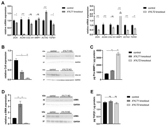 Analysis of extracellular matrix (ECM)-associated genes and proteins from XYLT1 or XYLT2 KO fibroblasts. (A) The control (n = 1) and the two KO cultures (n = 1) were seeded at a cell density of 50 cells/mm2 and analyzed by the ΔΔCT method after 72 h of cultivation for the analysis of DCN, ACAN, COL1A1, MMP1, ACTA2 and TGFB1 mRNA expressions. The expression of RPL13A, SDHA and B2M genes was used for normalization. Means with standard errors presented are composed of three biological, as well as three technical, replicates each. Quantification of ColI (B) and α-SMA (D) was performed by Western blot after 144 h of cultivation. Quantification was performed by ImageJ and GAPDH expression was used for normalization. Means with standard errors presented are composed of three biological replicates. Pro-MMP1 (C) and TGFβ1 (E) expressions were quantified by ELISA and normalized to total protein concentration. Means with standard errors presented are composed of three biological and as three technical replicates each (ns = not significant; * p < 0.1; ** p < 0.01; **** p < 0.0001).
