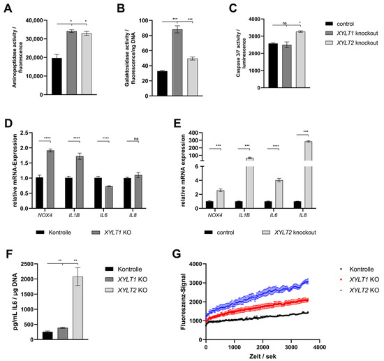 Analysis of different markers for the analysis of viability, senescence, apoptosis and oxidative stress in XYLT1 or XYLT2 KO fibroblasts. (A) Cells were seeded at a cell density of 70 cells/mm2 and the aminopeptidase activity of four biological replicates was determined after 72 h for the quantification of viability. (B) The cellular senescence was determined by SA β-galactosidase activity after 72 h from three biological and two technical replicates. Normalization was performed by reference to the total DNA concentration. (C) Apoptosis quantification after 74 h was performed using caspase 3/7 activity. This was based on three biological replicates. (D,E) The control and XYLT1 and XYLT2 KO fibroblasts were seeded at a cell number of 50 cells/mm2 and analyzed after 72 h using the ΔΔCT method for the relative gene expression analysis of NOX4, IL1B, IL6 and IL8. RPL13A, SDHA and B2M were used as housekeeping genes. The mean values with standard errors presented are composed of three biological and three technical replicates. (F) The IL6 protein expression was quantified by ELISA after 72 h in the supernatant of the cultures. The mean values and the standard error are composed of three biological replicates and were related to the total DNA of the samples. (G) An amount of 250 cells/mm2 were seeded and the uptake of Fluo-8 was analyzed in six replicates each after 24 h to determine the intracellular Ca2+ concentration (ns = not significant; * p < 0.1; ** p < 0.01; *** p < 0.001; **** p < 0.0001).