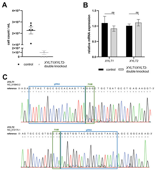 A persistent double KO (dKO) of XYLT1 and XYLT2 was to be introduced into neonatal dermal fibroblasts to generate completely XT-deficient fibroblasts. Consequently, the fibroblasts were sequentially transfected with one RNP-based CRISPR/Cas9 complex each for XYLT1 and XYLT2. The transfections were performed 24 h apart. Only 1.2 × 104 cells could be detected in the XYLT1/XYLT2 dKO fibroblasts 48 h after the second transfection with a CRISPR/Cas9 complex (Figure 5A; control: 2.3 × 105 cells). The mRNA expression of the target genes XYLT1 and XYLT2 showed no changes in expression compared to the controls (Figure 5B). The DNA of the double-transfected fibroblasts showed a subsequence in addition to the main sequence in the area of the gRNA bindings for XYLT1 and XYLT2 (Figure 5C). However, this is hardly detectable but could indicate mutations in the cell pool. Overall, it was not possible to establish a stable and effective XYLT dKO in the fibroblasts.