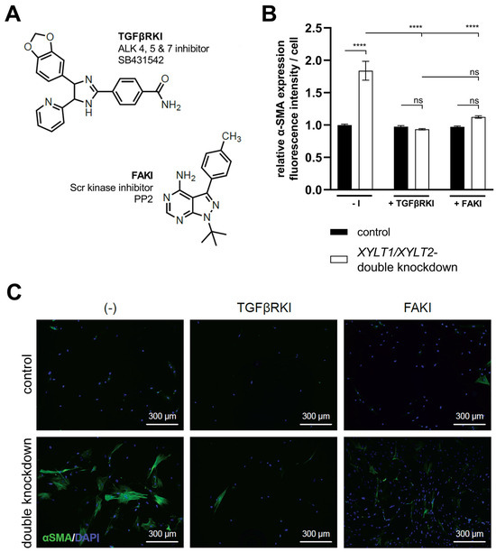 The XYLT1/XYLT2 dKD showed an induction of ECM protein expression, which is characteristic for myofibroblast differentiation. The TGFβ signal transduction can trigger the differentiation of fibroblasts into myofibroblasts. TGFβ induces the de novo synthesis of α-SMA and, thus, the formation of the myofibroblast-typical phenotype and a feed-forward reaction of further cytokine production [34]. The signaling pathway was inhibited to analyze the causal relationship between TGFβ1 induction and myofibroblast differentiation in XYLT1/XYLT2 dKD fibroblasts. The specific inhibition of the kinase domain of the TGFβ receptor was investigated using SB431542 (TGFβRKI). In addition, the signal transduction via the FAK, which is also relevant for myofibroblast differentiation, was inhibited by the specific inhibition of the Scr domain using PP2 (FAKI) (Figure 8A).