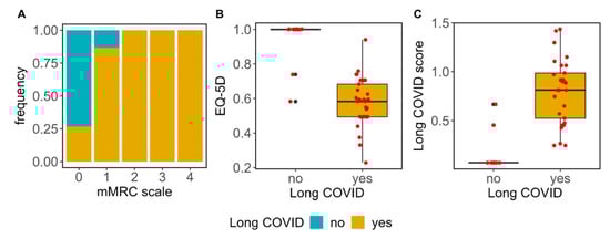 Participants were evaluated using the mMRC scale to test for dyspnea related to activity, which ranges from 0 (no breathlessness) to 4 (severe breathlessness), and the EQ-5D questionnaire. In our cohort, breathlessness, which was measured with the mMRC scale (Figure 1A), demonstrated a significant association with Long COVID (p-value = 0.000123); additionally, Long COVID patients registered a lower score on the EQ-5D (Figure 1B) compared to those who had fully recovered (0.58 [0.19] vs. 1.00 [0.00], respectively; p-value = 0.000003).