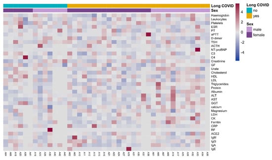 Clinical laboratory parameters in Long COVID cohort participants. Clinical parameters were measured during the medical visit to diagnose patient classification, either as having or not having Long COVID. A heatmap is plotted using the distribution of participants in columns depending on their diagnosis of Long COVID and sex. No clustering of clinical parameters was observed based on these two categories. ESR, erythrocyte sedimentation rate; PT, prothrombin time; aPTT, activated partial thromboplastin time; TSH, thyrotropin; NT-proBNP, N-terminal pro-B type natriuretic peptide; C3, complement component 3; C4, complement component 4; GF, glomerular filtrate; LDL, low-density lipoproteins; HDL, high-density lipoproteins; ALT, alanine amino transferase; AST, aspartate amino transferase; GGT, gamma-glutamyl transferase; LDH, lactate dehydrogenase; CK creatine kinase; CRP, C-reactive protein; RF, rheumatoid factor; ACE2, angiotensin converting enzyme-2; Ig, immunoglobulin. Mann–Whitney U test showed no association of any clinical laboratory variable with Long COVID.