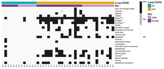 Presence of Long COVID symptoms in our Long COVID cohort. Long COVID symptoms were assessed as present (1, yes) or not (0, no) for all participants in our cohort and plotted in a heatmap. Participants were distributed along the columns based on their diagnosis of Long COVID and sex. Clinical symptoms showing a significant association with patients with Long COVID are indicated by asterisks, referring to their p-value significance: * p< 0.05, ** p < 0.01, *** p < 0.001, **** p < 0.0001. Fisher’s exact test was used.