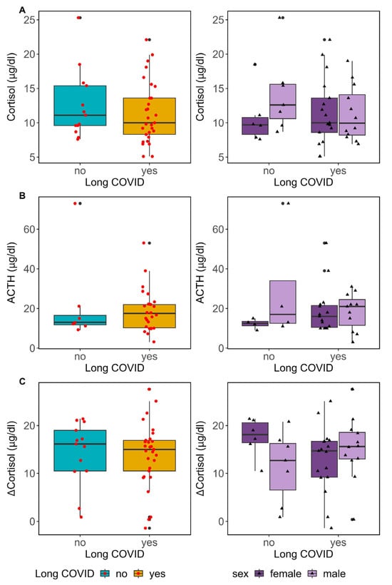 Pituitary–adrenal examination in our Long COVID cohort. Evaluation of basal cortisol and ACTH levels in the context of Long COVID. (A) Cortisol levels were measured at 8:00 a.m. for all participants and the results are subsequently presented in a box plot based on their Long COVID status. Left, the median levels of cortisol were equivalent in both groups (Mann–Whitney statistics test, p-value = 0.52). Right, participants with and without Long COVID were classified by sex, and cortisol levels were plotted for each group. The 2-way ANOVA statistical test showed no differences in any category (adjusted p-value: by Long COVID = 0.48; by sex = 0.54; interaction = 0.26). (B) ACTH levels were measured concomitantly to establish cortisol levels and the results are presented in a box plot according to Long COVID status. The median levels of ACTH were equivalent in both groups (p-value = 0.53) (Left), even when they were also analysed by sex (adjusted p-value: by Long COVID = 0.71; by sex = 0.45; interaction = 0.11). (C) Cortisol increases after 1 h of ACTH stimulation (ΔCortisol) were plotted based on the Long COVID status of participants (left) and also their sex (right). The 2-way ANOVA statistical test showed no differences in any category (adjusted p-value: by Long COVID = 0.29; by sex = 0.78; interaction = 0.67).