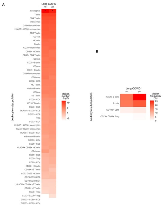 Blood immune cell predominance in the context of Long COVID. (A) Immune cell counts of different leukocyte subpopulations between patients with Long COVID (yes Long COVID) and recovered participants (no Long COVID) were plotted as the log2 of the median’s group. Asterisks point out those leukocyte subpopulations with significant differences between both groups. Mann–Whitney U test, * p < 0.05. (B) Leukocytes subpopulations with significant (p < 0,05) differences in their percentages between participants with or without Long COVID. The frequency referred to their parental cells (see Supplementary Figure S4). cm, central memory; em, effector memory; emra, effector memory CD45RA-positive; NK, natural killer; Treg, regulatory T cells. The Mann–Whitney U test was performed.