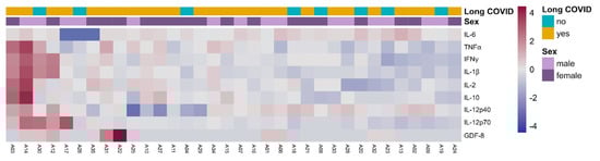 Inflammation in Long COVID. Heatmap plot of inflammatory molecules in participants with or without Long COVID, segregated by sex. Two-way ANOVA statistical test showed no differences in any category for each cytokine.