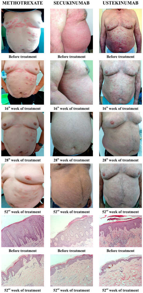 All applied therapeutic procedures induced an improvement in the clinical presentation of the disease, as well as a resolution of histopathological marks of psoriasis. Figure 1 shows the clinical changes of psoriatic lesions since the diagnosis and evaluation of the patients, and then at the 16th, 28th, and 56th week from the beginning of therapy (MTX, secukinumab, and ustekinumab). Furthermore, Figure 1 shows the histopathological changes of psoriatic lesions before the introduction of therapy and after 52 weeks.