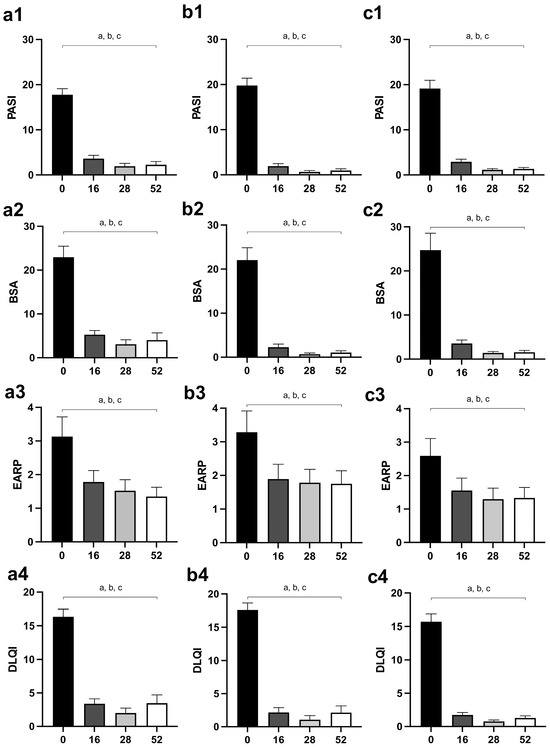 Changes of disease activity outcomes (PASI and BSA) and patient-reported outcomes (EARP and DLQI) in different groups of psoriatic patients—(a1–a4), patients treated with MTX; (b1–b4), patients treated with secukinumab; (c1–c4), patients treated with ustekinumab. The values are shown for points of interest: 0, before the introduction of therapy, as well as after 16, 28, and 52 weeks of therapy. A p-value of less than 0.05 (p < 0.05) was considered statistically significant. A, a—difference between the beginning of the therapy and the 16th week of the treatment; b—difference between the beginning of the therapy and the 28th week of the treatment; c—difference between the beginning of the therapy and the 52nd day of the treatment. Abbreviations: PASI—Psoriasis Area Severity Index; BSA—Body Surface Area; EARP—Early Arthritis for Psoriatic Patients; DLQI—Dermatology Life Quality Index; MTX—methotrexate.
