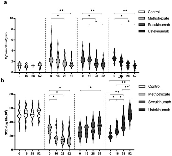 Levels of O2− and SOD showed the most pronounced changes when comparing values between groups and within the same group (Figure 3). In all groups of patients with psoriasis, the values of O2− were significantly higher compared to the healthy controls (Figure 3a). On the other hand, the activity of SOD was significantly lower in the groups of patients with psoriasis compared to the healthy controls (Figure 3b). All applied therapeutic procedures induced a significant reduction in O2− levels, especially if the values before the introduction of therapy and after the 52nd week were compared (Figure 3a). Both applied biological drugs, secukinumab and ustekinumab, induced an increase in SOD activity, while MTX induced a further reduction in SOD activity (Figure 3b). O2− and SOD values between groups were compared before the initiation of therapy and in the 52nd week. Comparisons between groups are shown in Table 2. Values of O2− were significantly higher in psoriatic patients compared to healthy controls before the initiation of therapy, while at week 52, there were no differences between the groups. SOD activity was significantly lower in psoriatic patients in comparison to healthy individuals and MTX induced a further reduction in SOD activity, but even in the groups treated with biological drugs, SOD activity did not reach the values in the control group.