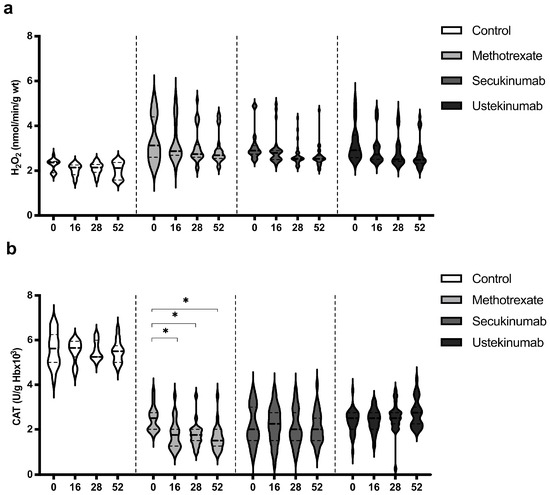 Values of H2O2 were similar in all groups, healthy controls, and psoriatic patients, and the applied therapeutic procedures did not induce any significant change in the H2O2 level (Figure 4a). CAT activity was significantly higher in the control group in comparison to all groups of patients with psoriasis. Biological drugs did not induce a significant change in CAT activity, while MTX induced a reduction in CAT activity (Figure 4b). H2O2 and CAT values between groups were compared before the beginning of therapy and in the 52nd week. Comparisons between groups are shown in Table 3. H2O2 level was significantly higher in the psoriatic groups of patients in comparison to the control group, and these values remained higher even at the last measurement point. CAT activity was lower in patients with psoriasis, and therapeutic procedures did not significantly change it, except for MTX, which further reduced CAT activity. Ustekinumab induced a slight increase in CAT activity and as a result, in the 52nd week, catalase activity was significantly higher in this group compared to patients treated with MTX and secukinumab.