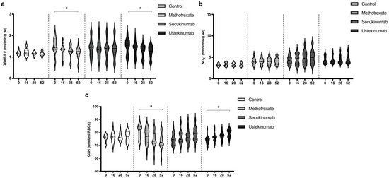 The index of lipid peroxidation, measured as TBARS, was on a similar level in all groups. MTX and ustekinumab induced a significant reduction in TBARS after 52 weeks of treatment (Figure 5a). Values of NO2−, as a marker of nitric oxide (NO) production, did not differ significantly between groups and did not change significantly during the application of the examined therapeutic procedures (Figure 5b). GSH values were similar between all groups. MTX induced a reduction in GSH values after 52 weeks of treatment, while ustekinumab induced a significant improvement of GSH after 52 weeks of therapy (Figure 5c). TBARS, NO2−, and GSH values between groups were compared before the beginning of therapy and in the 52nd week. Comparisons between groups are shown in Table 4. The values of TBARS and NO2− did not change significantly, and there were no differences between groups. GSH level in the MTX-treated group was higher compared to the other groups, but MTX induced a reduction in GSH, so that after 52 weeks of therapy, this biomarker was significantly lower in this group compared to the other groups.