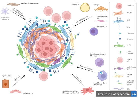Although predominantly observed to be of local origin, the potential origin of bone marrow has been studied in several tumor types, such as PDAC [42]. Mesenchymal stem cells from the bone marrow can differentiate into a subpopulation of CAFs under TGF-β, WNT, and IL-6/STAT3 signaling [43]. Similarly, bone marrow macrophages/monocytes can convert into CAFs [44]. The multiple cells of origin from which CAFs are suggested to derive are presented in Figure 1.