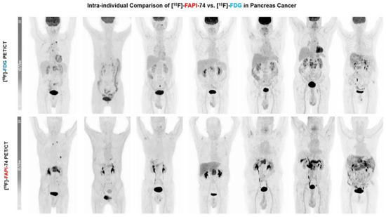 Maximum intensity projections (MIP) in seven patients: F18-FDG vs. F18-FAPI-74. Primary lesions exhibited substantially better image contrast and delineation with F18-FAPI-74. (Figure adapted from Novruzov et al. [130] under a CC BY license; link of the license: https://creativecommons.org/licenses/by/4.0/, accessed on 27 November 2023.).