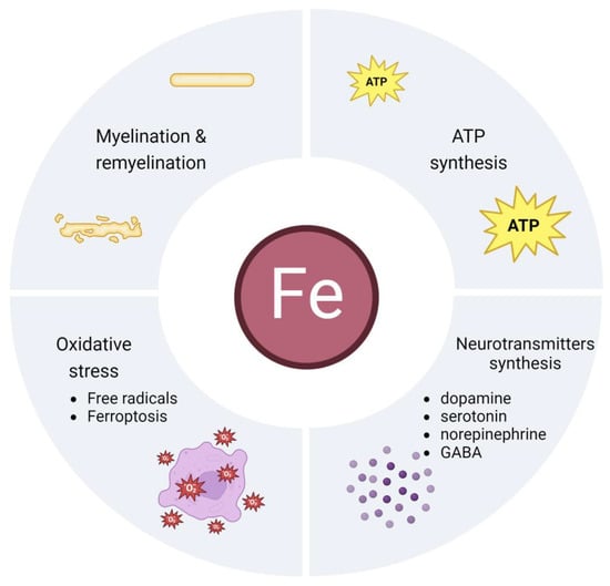 Iron is the most abundant metal in nature. Predominantly, iron is an essential cofactor of many cellular enzymes [1]. In humans, the daily requirement for this element is approximately 25–30 mg, depending on age, lifestyle, and gender. In paralel, iron deficiency is one of the most common single nutrient deficiencies [2,3]. Iron is essential for the general vital functions of every cell, as well as for certain neuronal activities. Excessive iron levels promote oxidative stress and mitochondrial damage, leading to cell death, including neuronal death. Neurodegeneration can therefore be defined by changes in ionic homeostasis and/or pro-oxidant/antioxidant balance, two states that vary significantly between different types of brain cells and with age [4]. Iron plays an important role in brain development from the prenatal period to the teenage years. The blood–brain barrier (BBB) modulates iron levels in the brain. In case of iron deficiency in the child, negative effects on myelinogenesis and synaptogenesis have been demonstrated, with negative effects on psychomotor and cognitive functions [5].