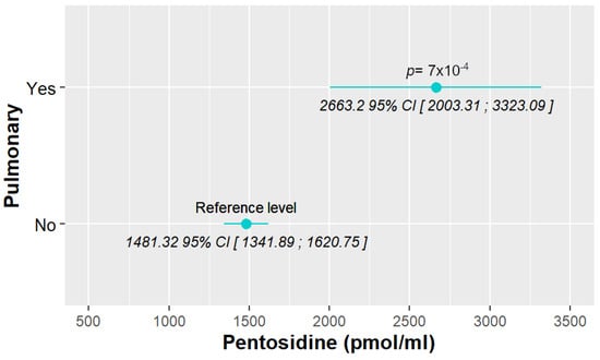 SLE characteristics that were significant in the exploratory analysis and possibly related to pentosidine levels were tested in a model adjusted for previously selected confounding variables (see Materials and Methods). After adjustment, only the presence of pulmonary manifestations (lupus pneumonitis and shrinking lung syndrome) was strongly associated (Figure 1). Specifically, patients with lung involvement had pentosidine levels that were 1181.8786 (95% CI [507.4192; 1856.3379], p < 0.001) units higher than those without lung involvement. The model, which does not have any confounding factors, is provided in Supplementary Table S4.