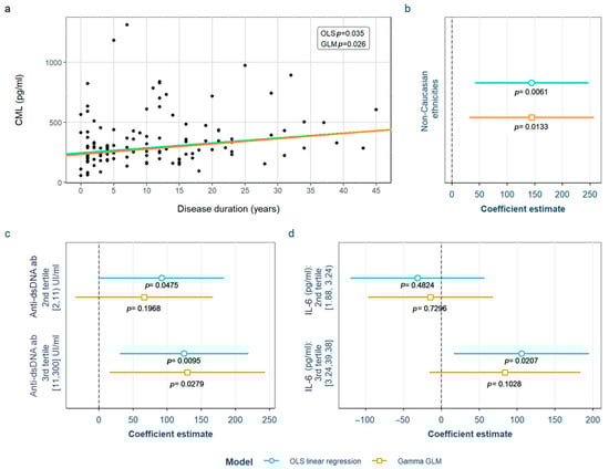 Statistically significant associations between CML and different systemic lupus erythematosus characteristics: (a) disease duration; (b) non-Caucasian ethnicities; (c) anti-dsDNA values; (d) IL-6 values. CML Nξ-(carboxymethyl)lysine; OLS: ordinary least squares; GLM: generalized linear model; IL-6: interleukin 6.