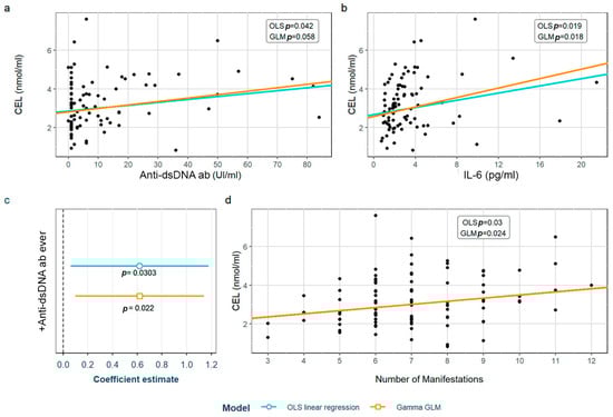 SLE characteristics that were significant in the exploratory analysis and possibly associated to CEL levels were tested in two models adjusted for the previously selected confounding variables (see Section 2). After adjustment, we found that the CEL levels correlated with anti-dsDNA antibodies, IL-6 levels and the number of accumulated manifestations throughout the disease (Figure 3a, Figure 3b, and Figure 3d, respectively). Furthermore, patients having ever had positive anti-dsDNA antibodies had significantly higher CEL levels (Figure 3c). These associations were found in both models except for one with the anti-dsDNA titers, which was only observed in the OLS linear regression model. Moreover, we found a correlation between CEL and CML levels (Supplementary Figure S4). The detailed models and their adjustments by confounding variables are provided in Supplementary Table S8.